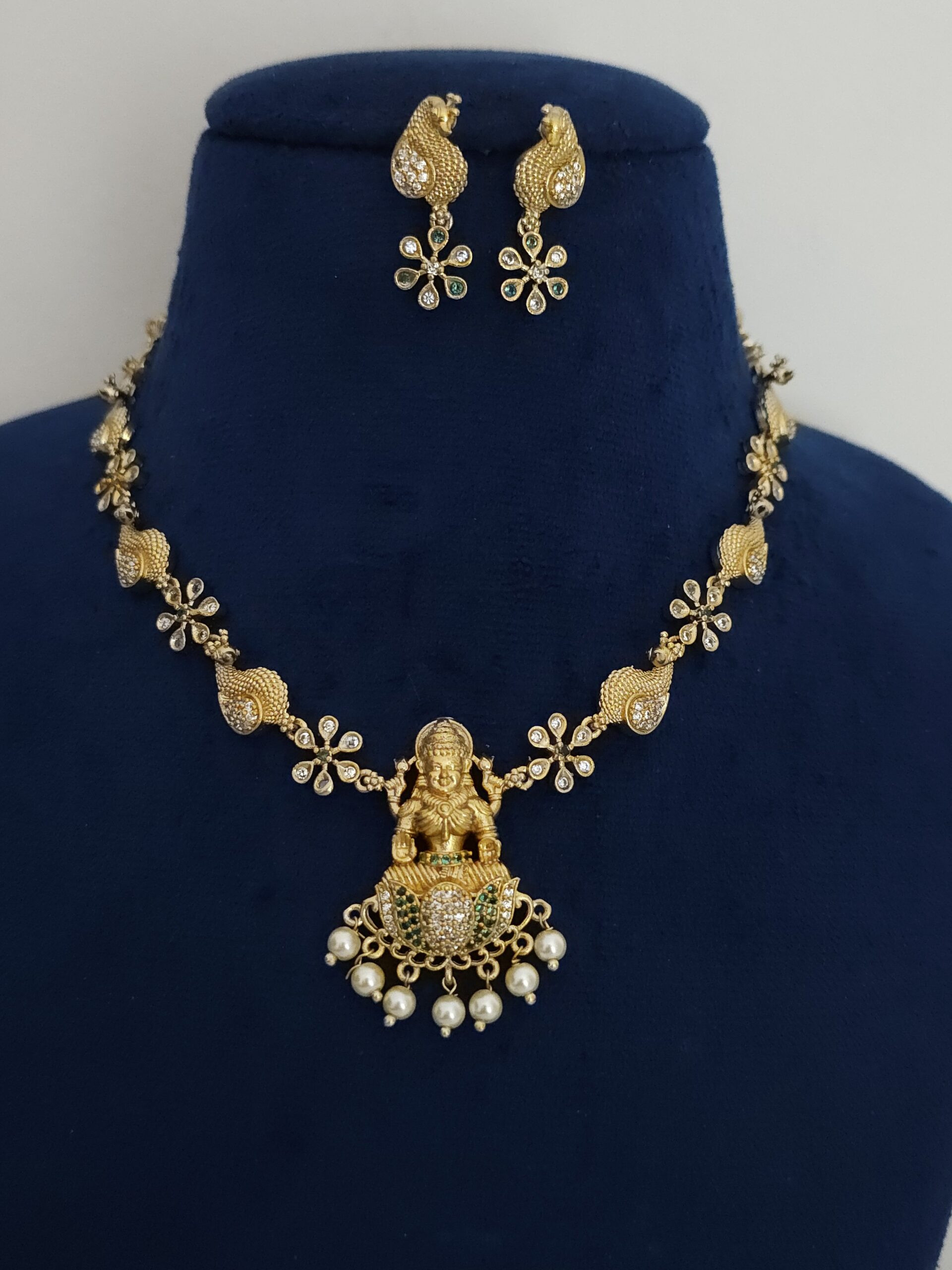 Be the first to review “Gold polish Laxmi neck set with green and white stones” Cancel reply